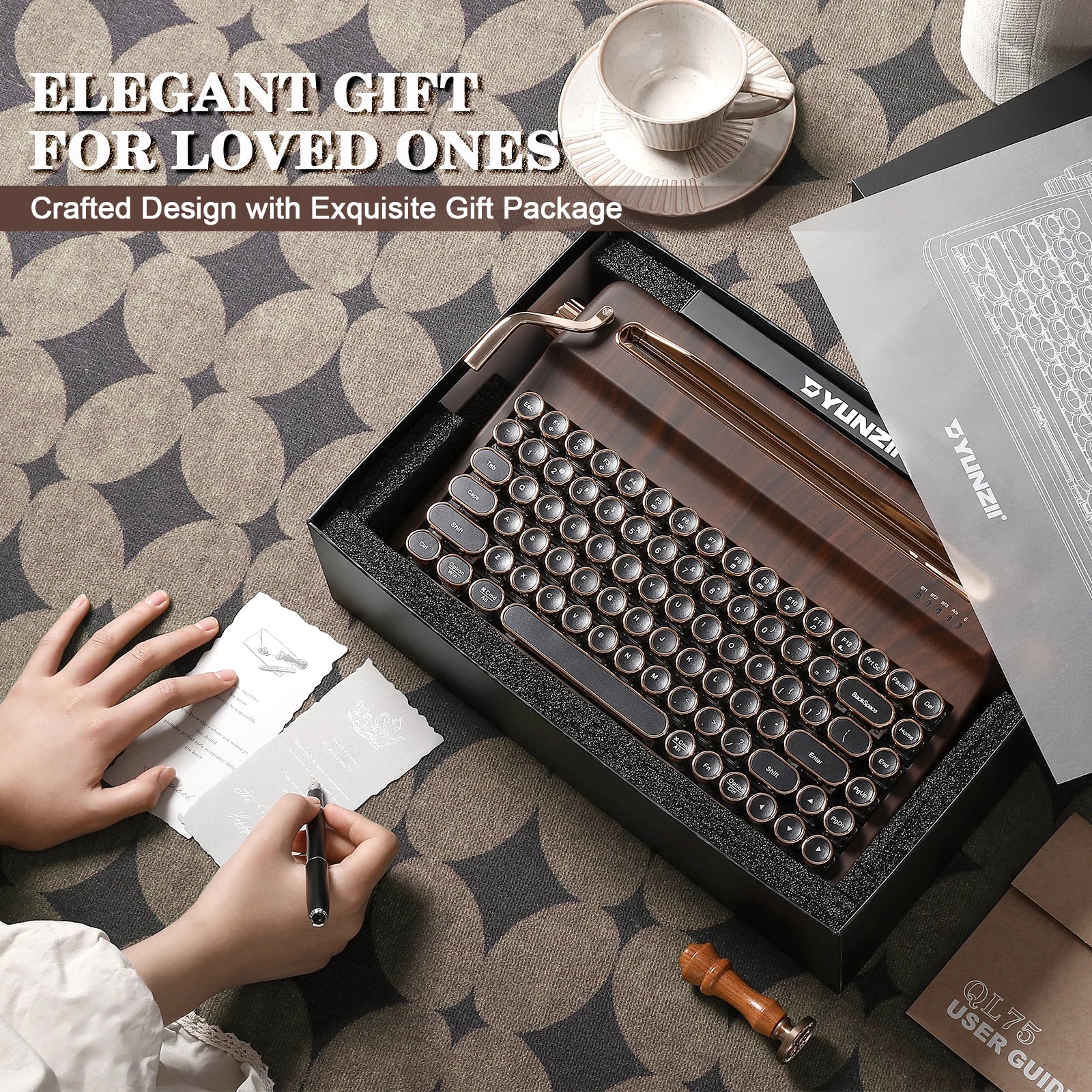 YUNZII QL75 retro keyboard features a unique typewriter-style keyboard aesthetic with tri-mode connectivity ( BT/2.4gHz wireless/ wired) and a built-in stand for multiple devices. Each key row of this mechanical keyboard gradually ascends height for an ergonomic and comfortable typing experience. With the keyboard typewriter-style design, round keycaps, and pre-lubed switches, the wireless keyboard is perfect for lovers of retro keyboard and typewriter-style aesthetics.