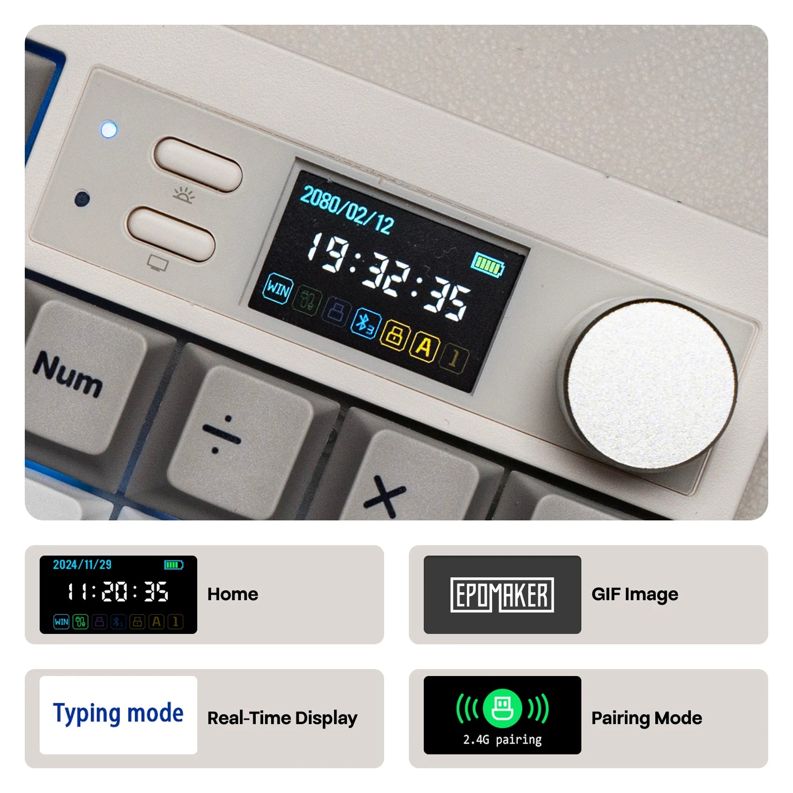 Missing the full set of keys unavailable on cramped compact keyboards? Step up your setup with the EPOMAKER QK108 for ultimate usability. This full-sized keyboard features 104 keys, a familiar complete layout that requires no learning curve, a fully customizable volume knob, and a vibrant Smart Screen. Program the easy-to-reach knob to control anything—from toggle brightness to scrolling through your playlist, or take the screen to check the date, monitor keyboard status or load up a custom GIF. No more fumbling with complex shortcuts, with the QK108 keyboard, get the full-sized comfort you demand, with the cutting-edge customization you deserve.