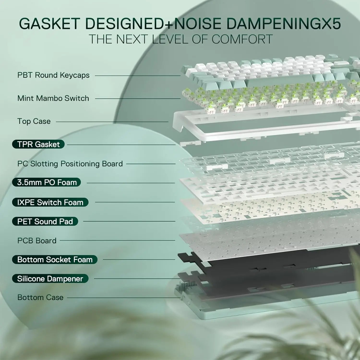 Noise Dampening x 5 - Equipped with 3.5mm PO foam, IXPE switch foam, PET sound pad, bottom socket foam, silicone bottom pad along with the silicone gasket. Significantly reduce the hollow noise, creating dampened and ultra-clean typing acoustics, making each keystroke satisfying and comfortable.